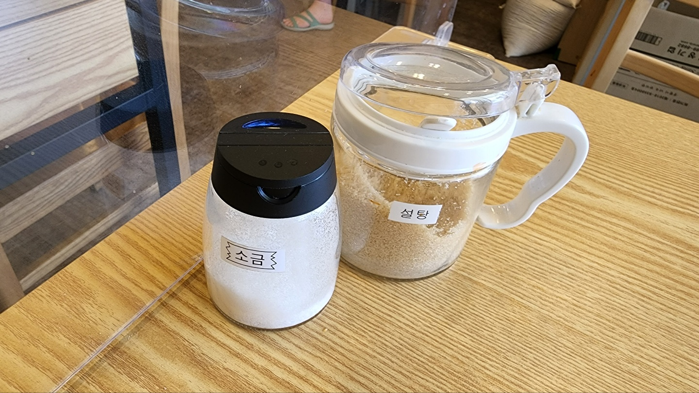 요렇게 테이블마다 소금과 설탕이 비치되어있는데요, 기호에 맞게 이용하시면 될것 같아요.
