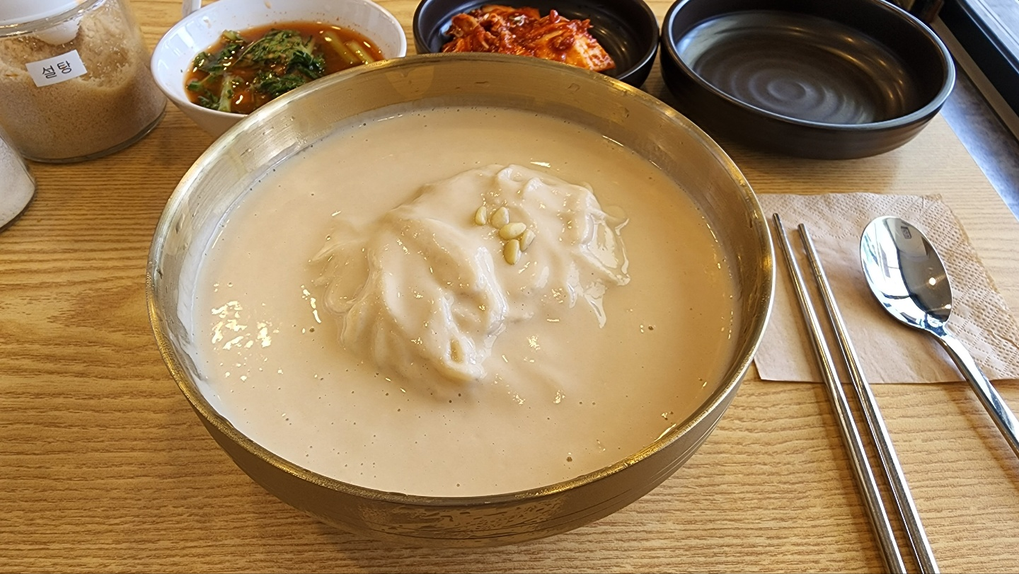 기본적으로 짜장면 면발 굵기의 면에 진한 콩국물이 일품이고, 잣을 고명으로 올려주시는데 요것도 같이 먹으면 고소하더라구요.