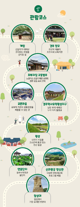 계림-경주향교-최부자집교동법주-교촌마을-경주역사유적월성지구-월성-연꽃단지-신라왕궁영상관-첨성대