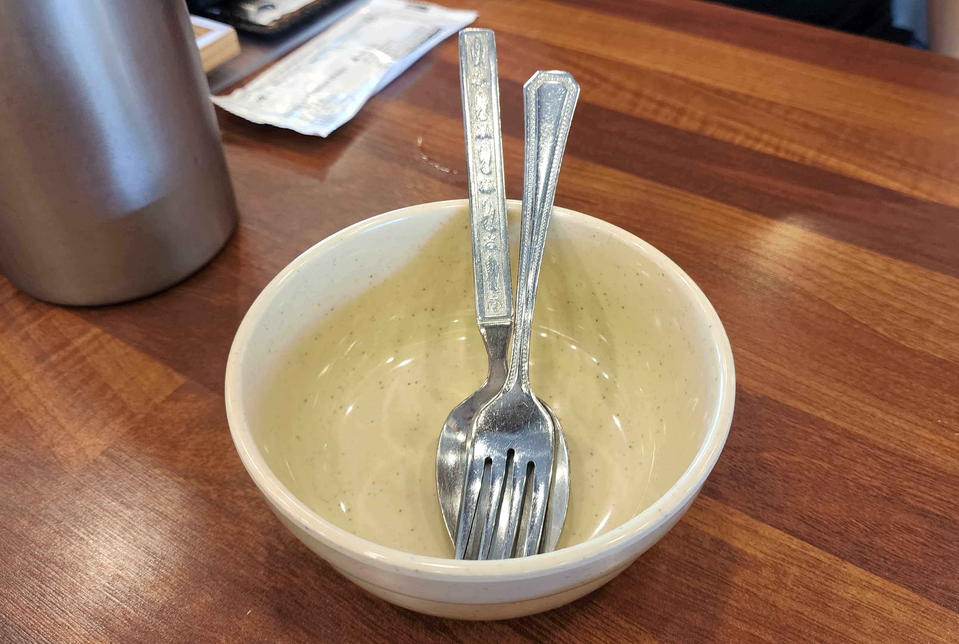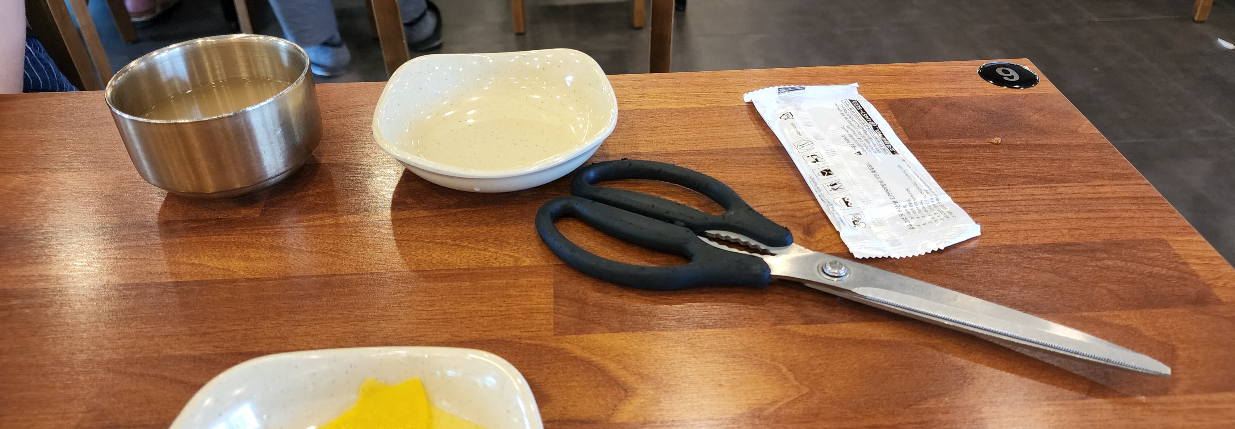 겨자소스, 식초, 소금 등이 자리마다 있었고 종이컵이 비치되어있었어요.