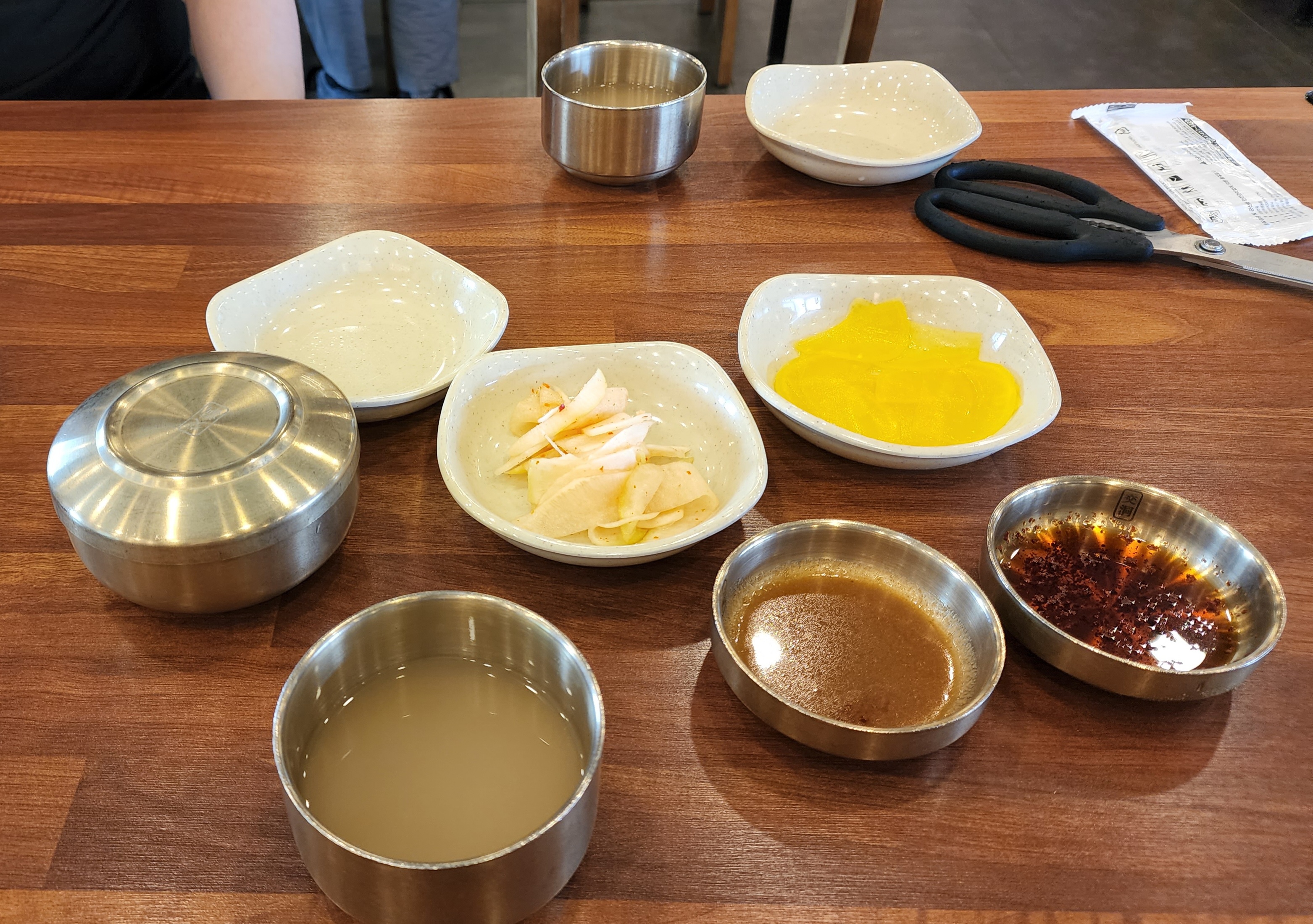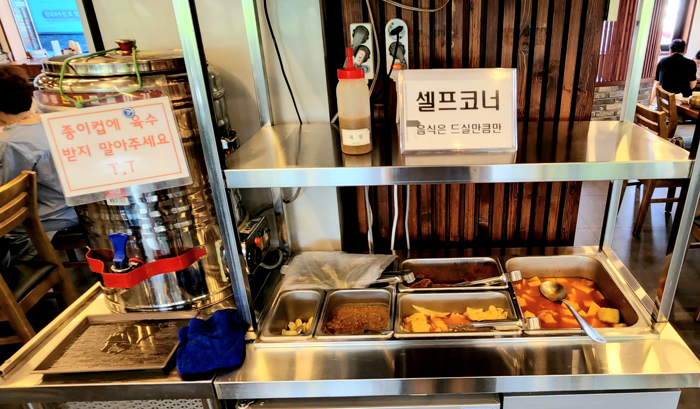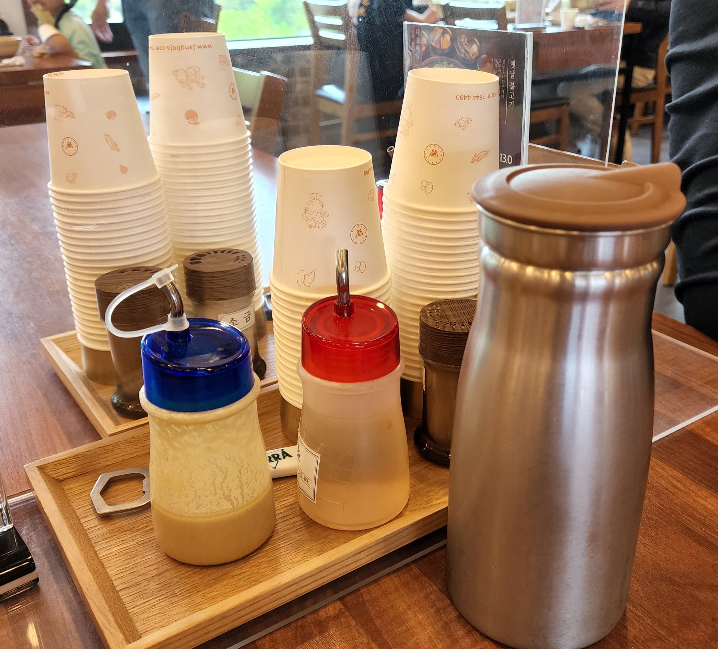 겨자소스, 식초, 소금 등이 자리마다 있었고 종이컵이 비치되어있었어요.