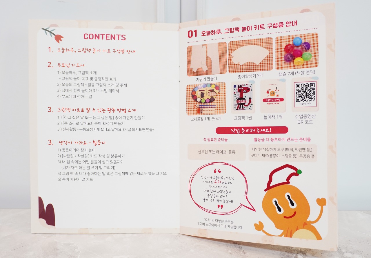 키트 구성도 알차지만, 제가 가장 맘에 들었던 부분은 유아동 그림책 놀이공간을 운영중인 <오늘하루, 그림책> 의 그림책큐레이터이자 유아교육 전문 선생님의 그림책 수업이 영상으로 제공 되기 때문에 기관을 방문하지 않고도 집에서 부모님과 아이가 알찬 그림책 수업을 진행할 수 있다는게 가장 큰 장점 인 것 같아요.