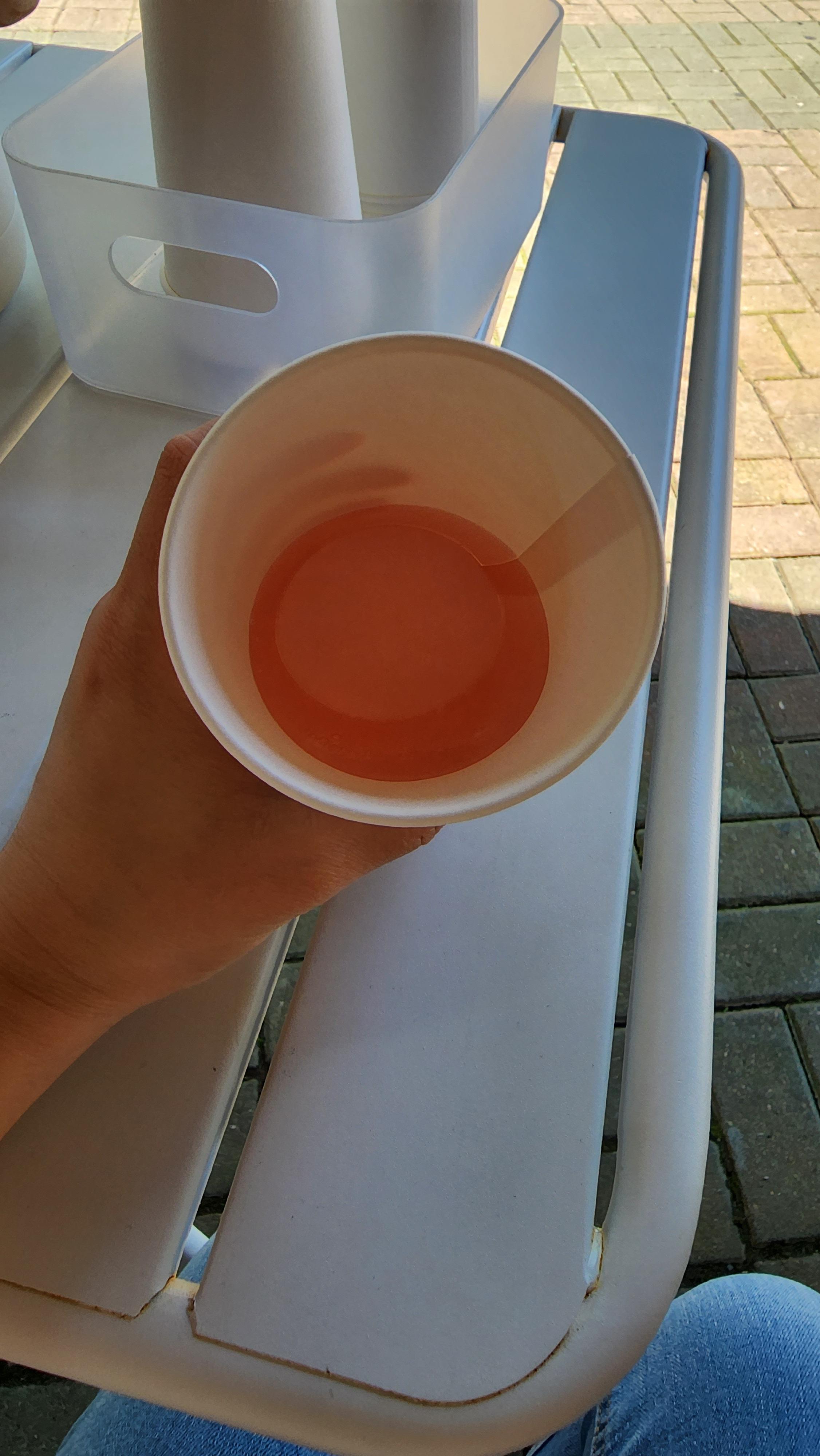 앞접시, 포크, 수저, 컵, 냅킨과 손소독젤, 그리고 레몬과 로즈마리가 들어있는 물을 주셨어요.