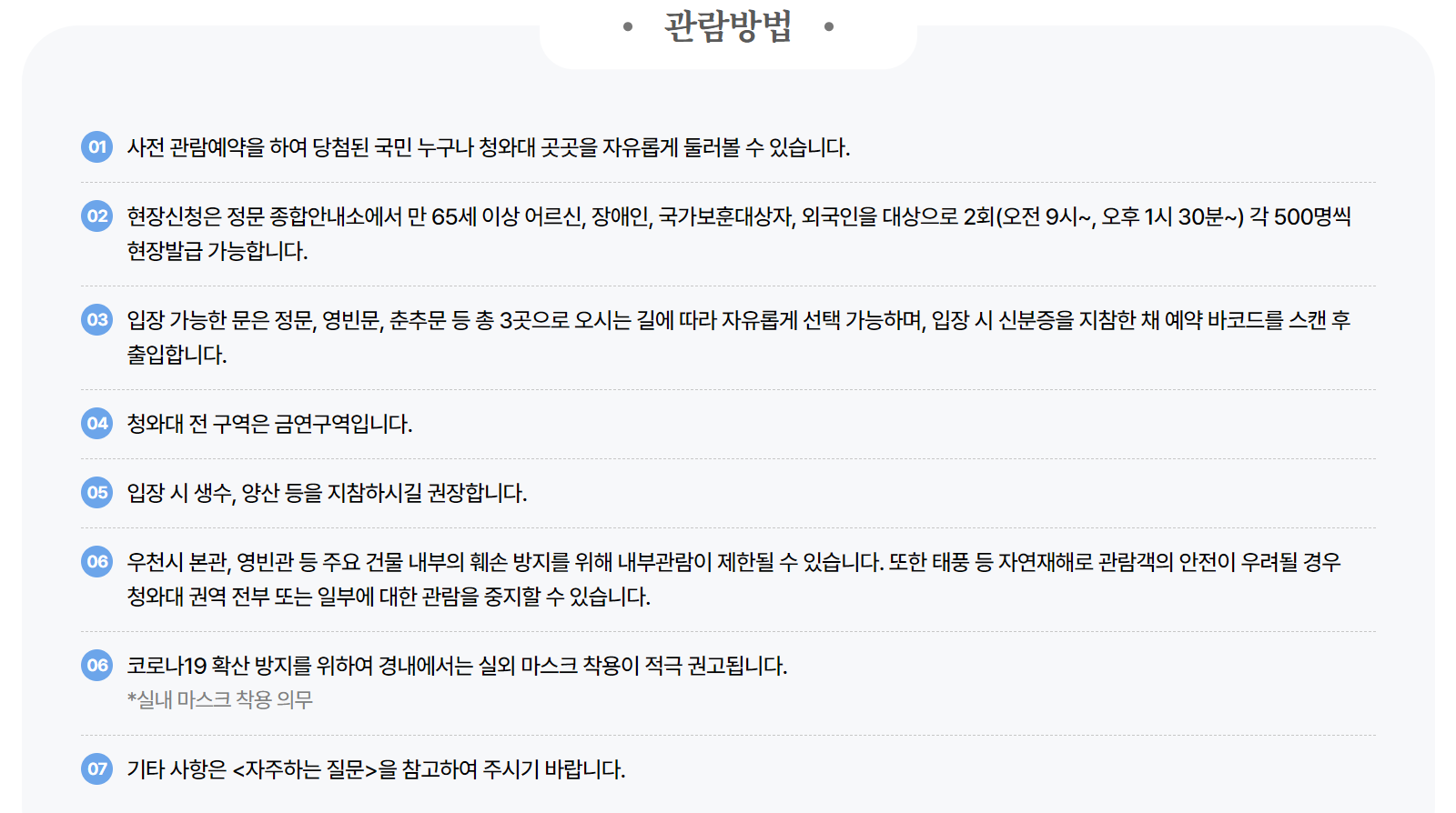 청와대 관람신청은 선착순으로 가능하며, 예약완료 시에는 취소 전까지 추가 신청이 불가합니다.