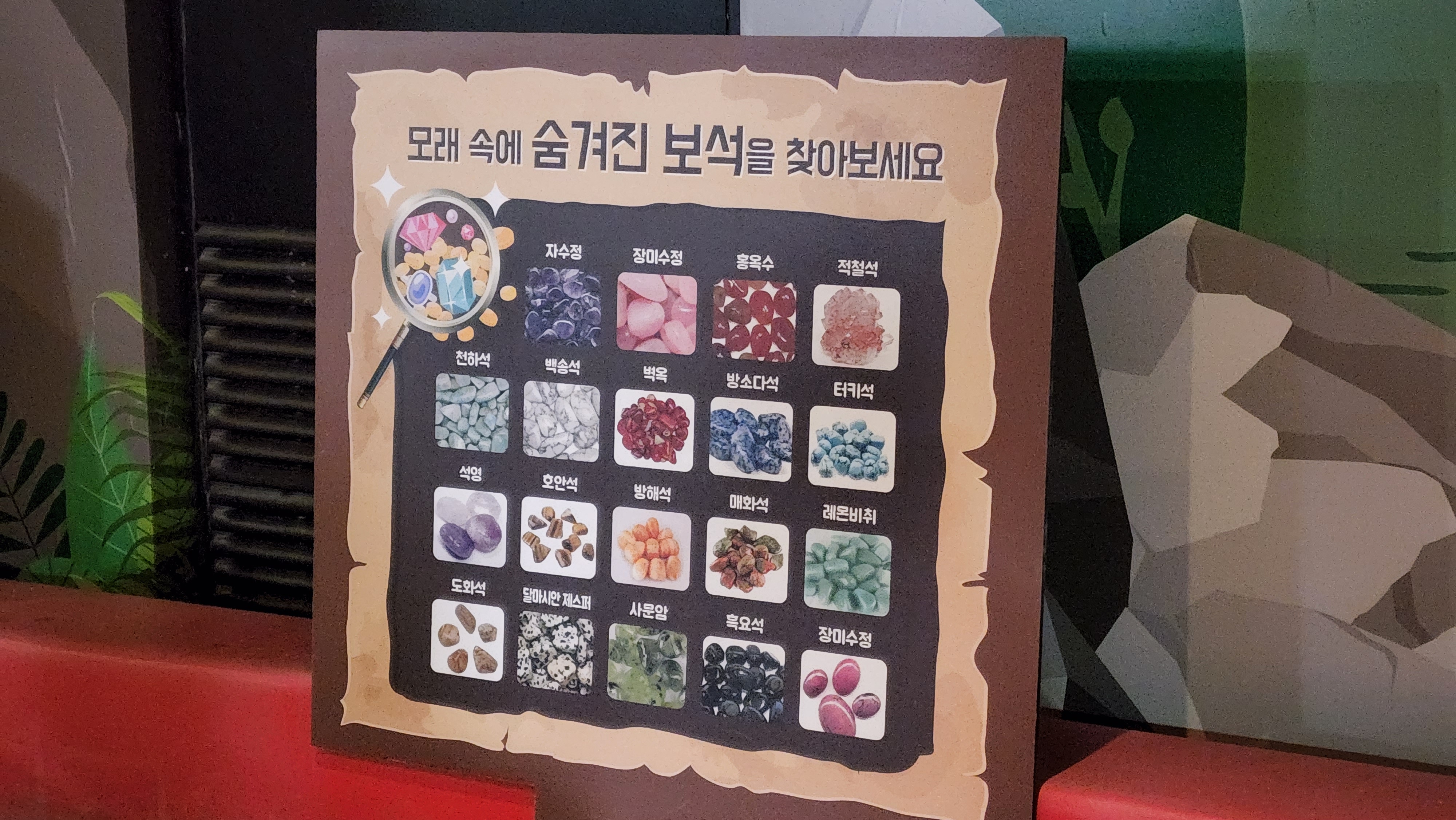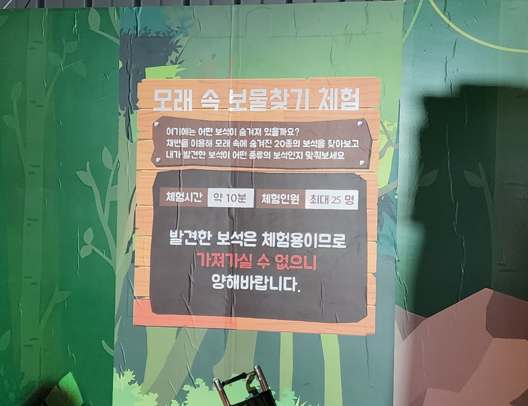 모래속 보물찾기 체험이 있는데 광물을 찾기만 하고 가져갈 수 없는 점이 아쉽더라구요.