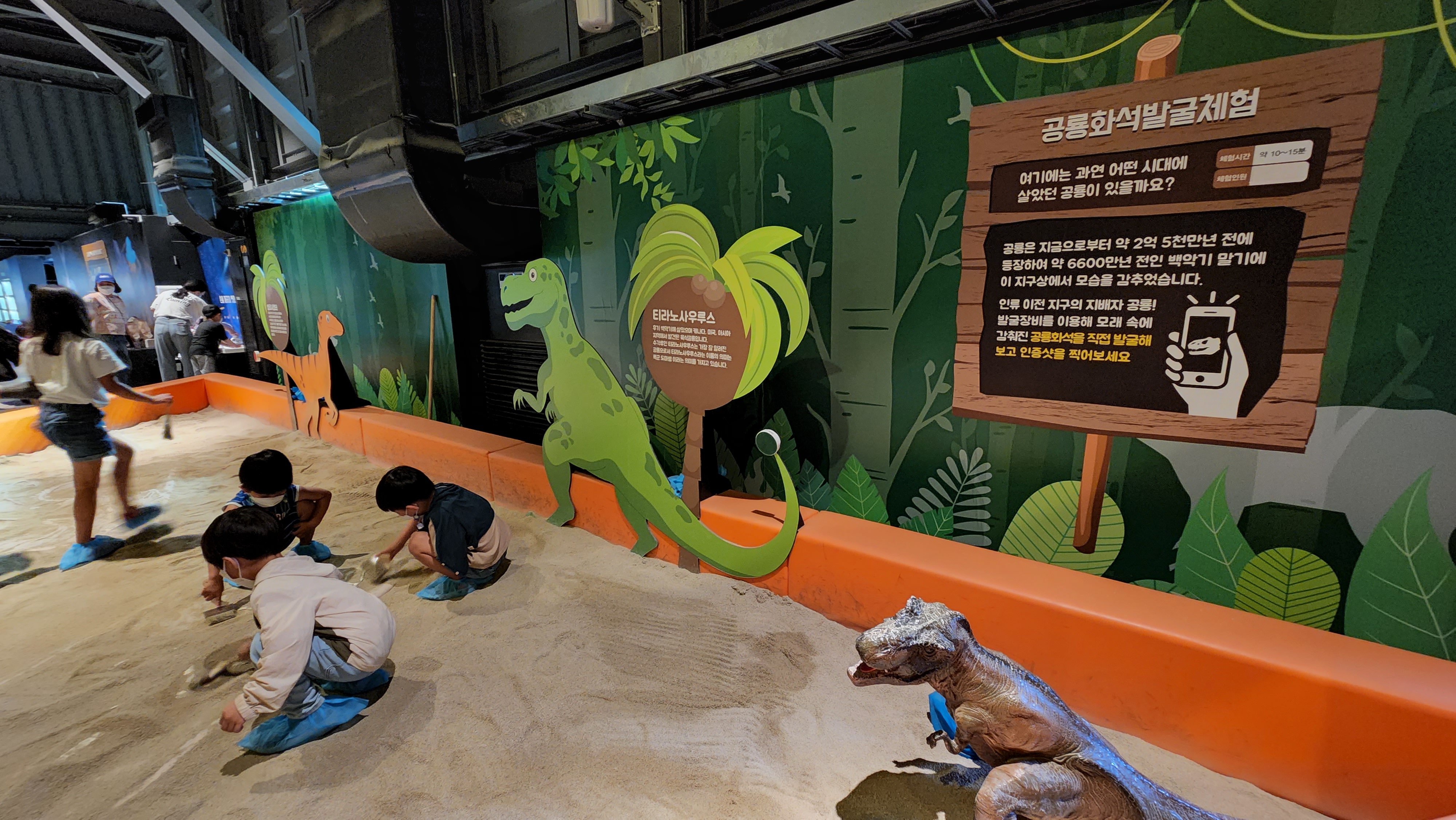 모래속에 파묻혀있는 공룡뼈를 솔로 살살 들어내는 작업을 해보는 체험존이었는데 애들이 엄청 좋아하더라구요.