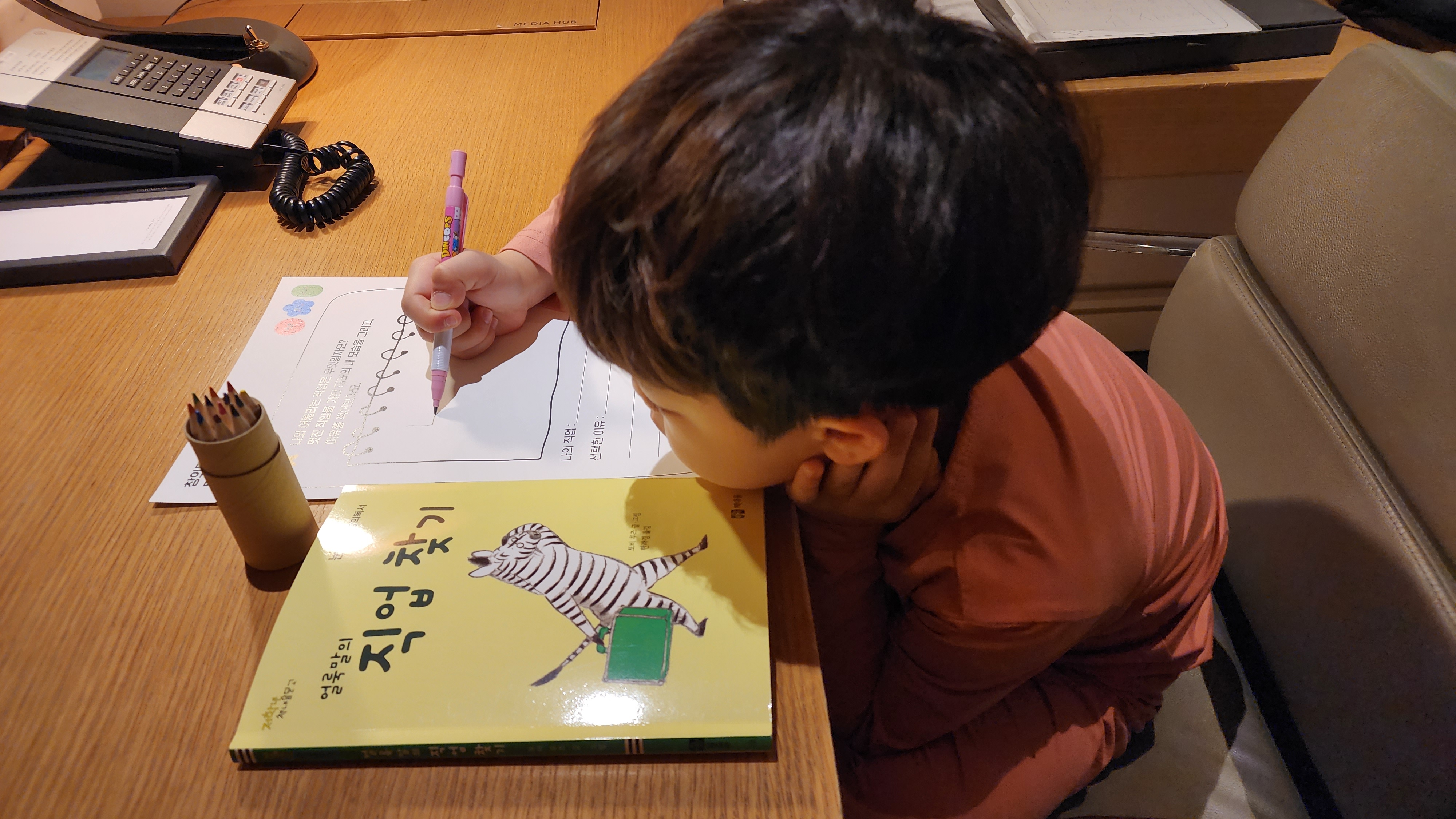 저랑 동글이는 보통 잠자기 전에 책을 함께 읽는데요, 이번에는 동글이 생일 겸 호캉스 갈 때 책과 활동지를 챙겨갔었답니다.