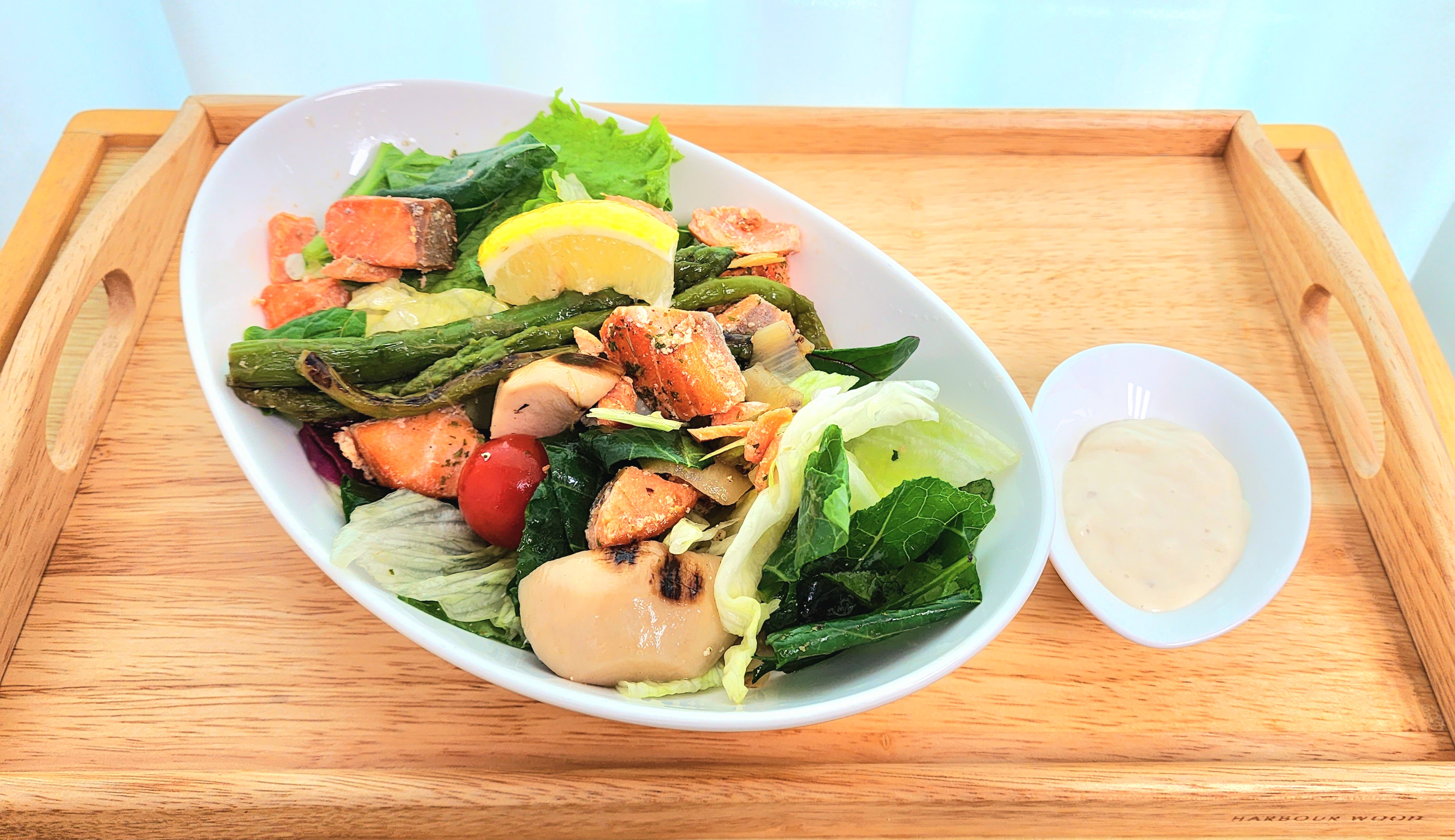 구운연어, 구운아스파라거스, 구운양파, 구운버섯 외에 생야채로 로메인, 적근대, 케일, 치커리, 양상추가 넉넉하게 들어있었고 방울토마토와 레몬1조각 수제 드레싱까지 이쁘게도 들어있더라구요.