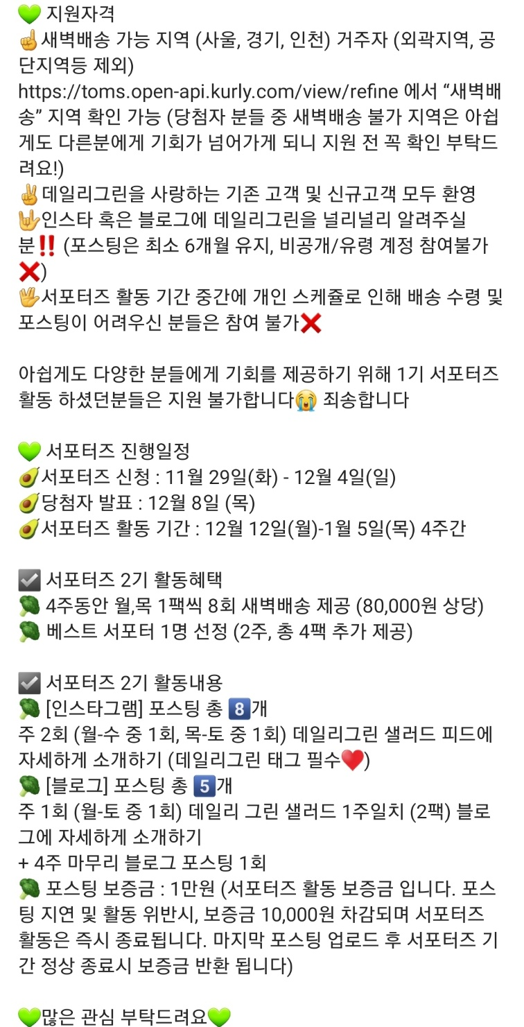 데일리그린 서포터즈 2기에 선발이 되어 12월 12일(월)-1월 5일(목) 4주간 샐러드를 제공받게 되었어요.