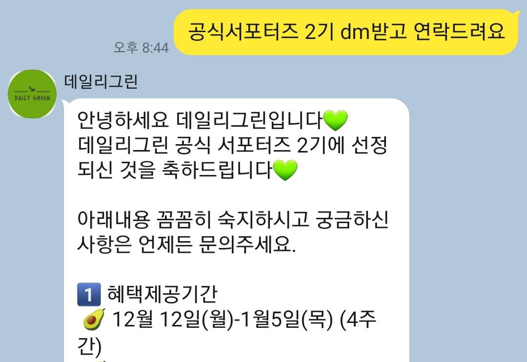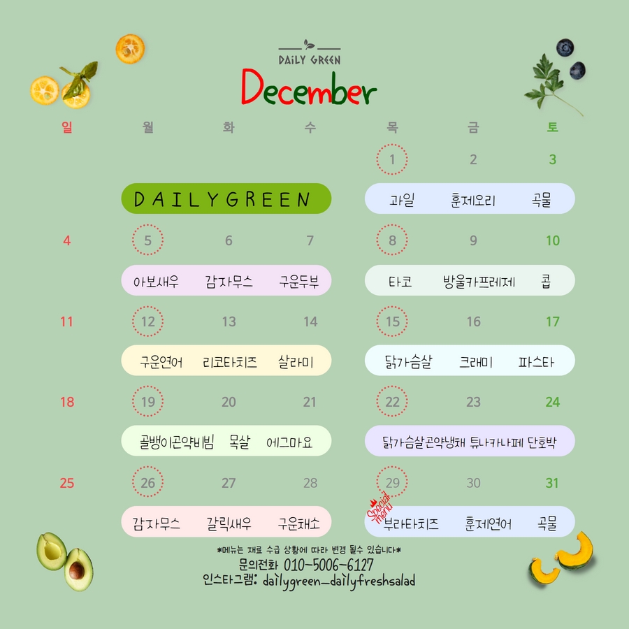 데일리그린 서포터즈 2기에 선발이 되어 12월 12일(월)-1월 5일(목) 4주간 샐러드를 제공받게 되었어요.