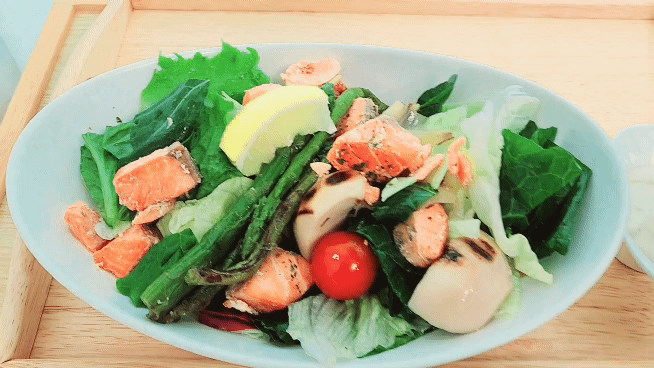 첫번째로 받은 샐러드는 연어스테이크 예요.