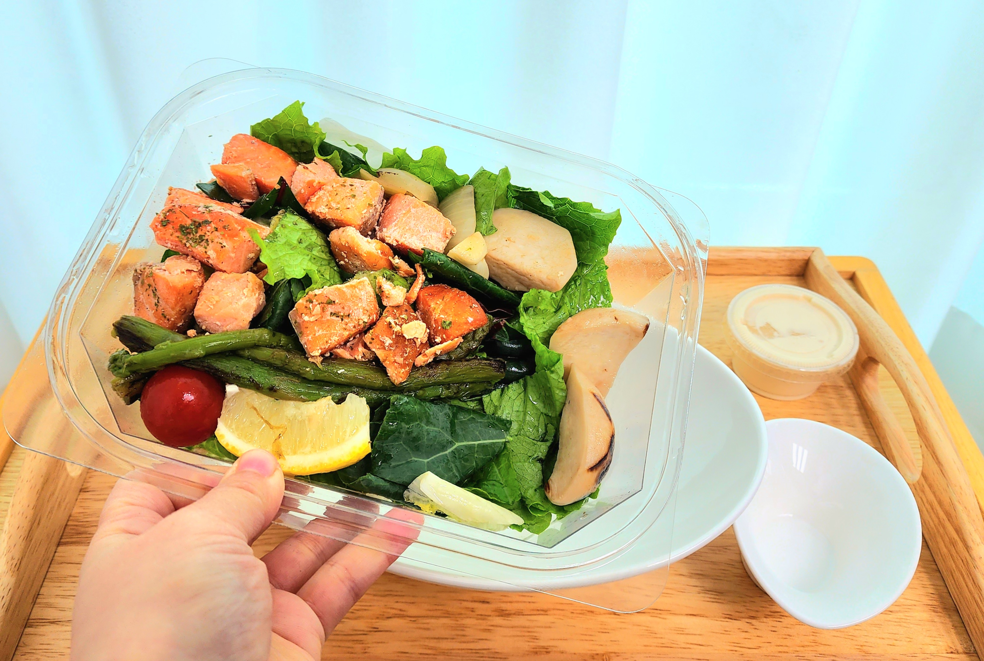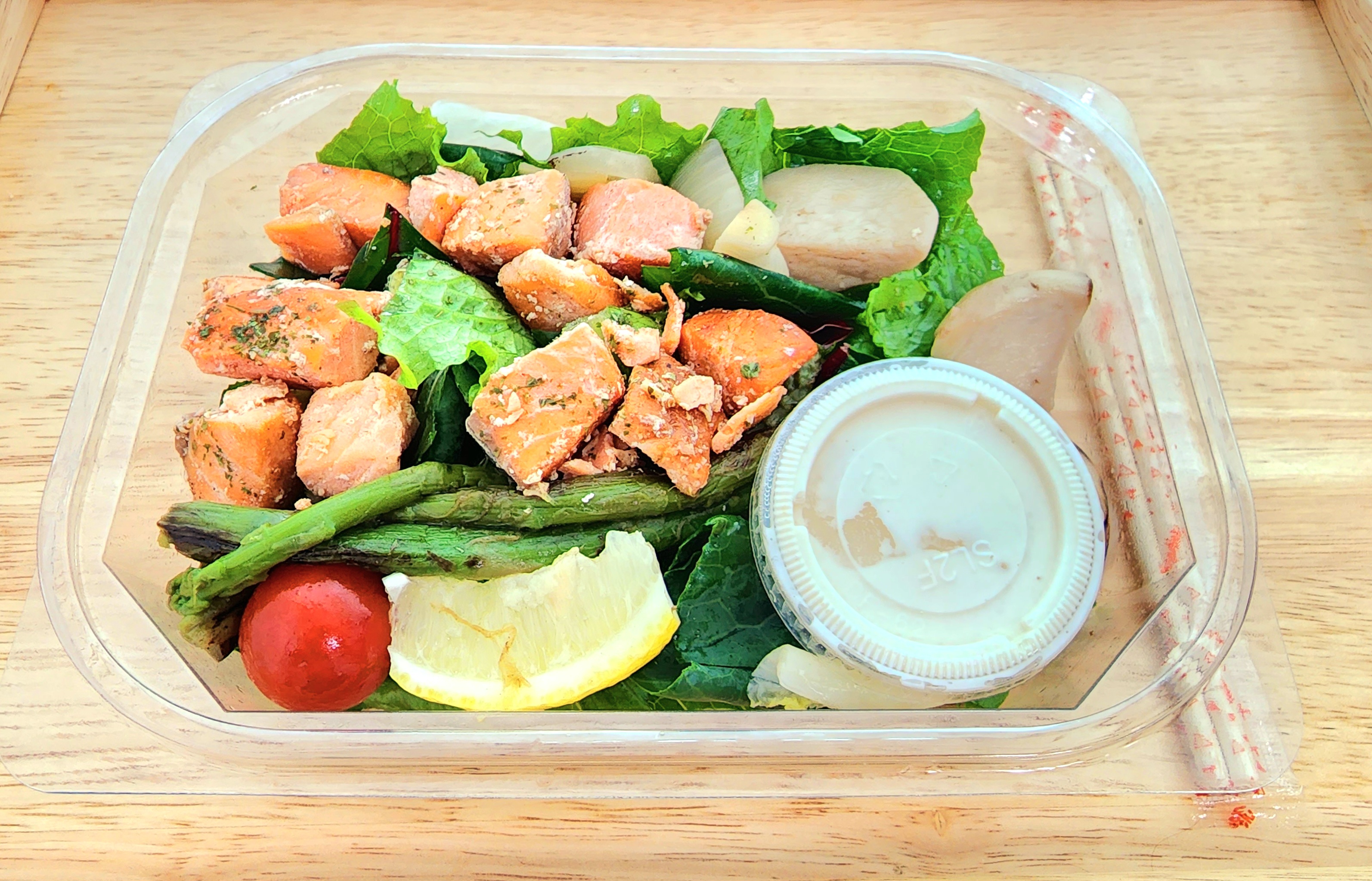 구운연어, 구운아스파라거스, 구운양파, 구운버섯 외에 생야채로 로메인, 적근대, 케일, 치커리, 양상추가 넉넉하게 들어있었고 방울토마토와 레몬1조각 수제 드레싱까지 이쁘게도 들어있더라구요.