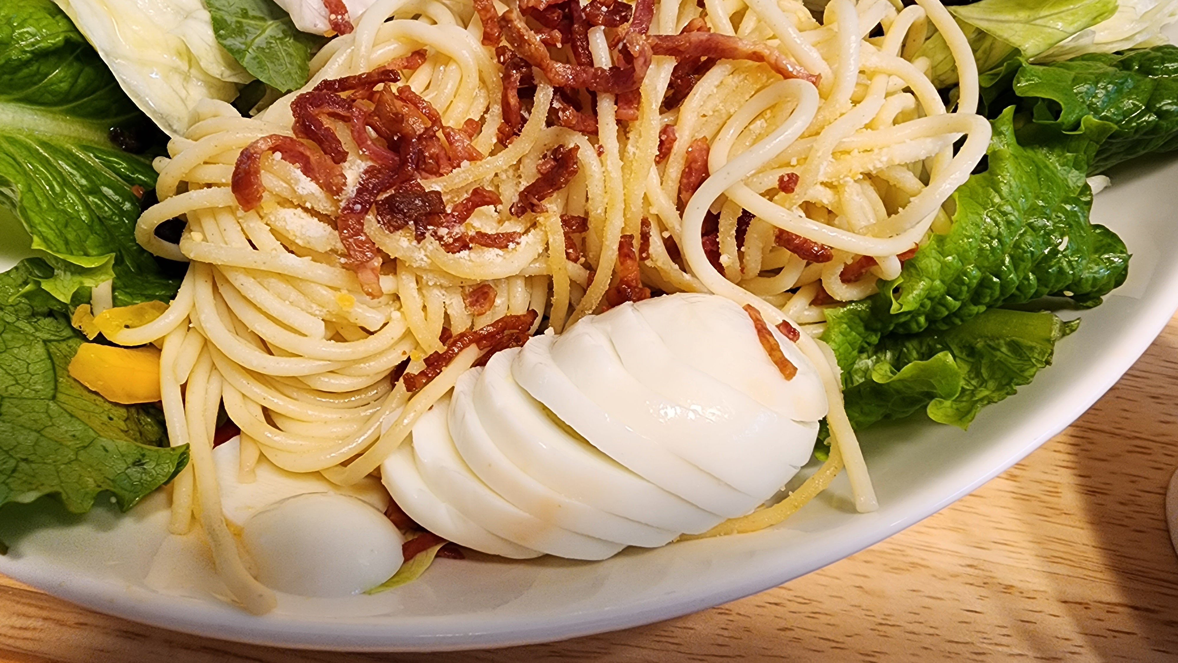 파스타면, 치즈가루, 구운 베이컨 다진것, 파프리카, 삶은달걀, 양파, 로메인, 적근대, 케일, 치커리, 양상추가 넉넉하게 들어있었어요.