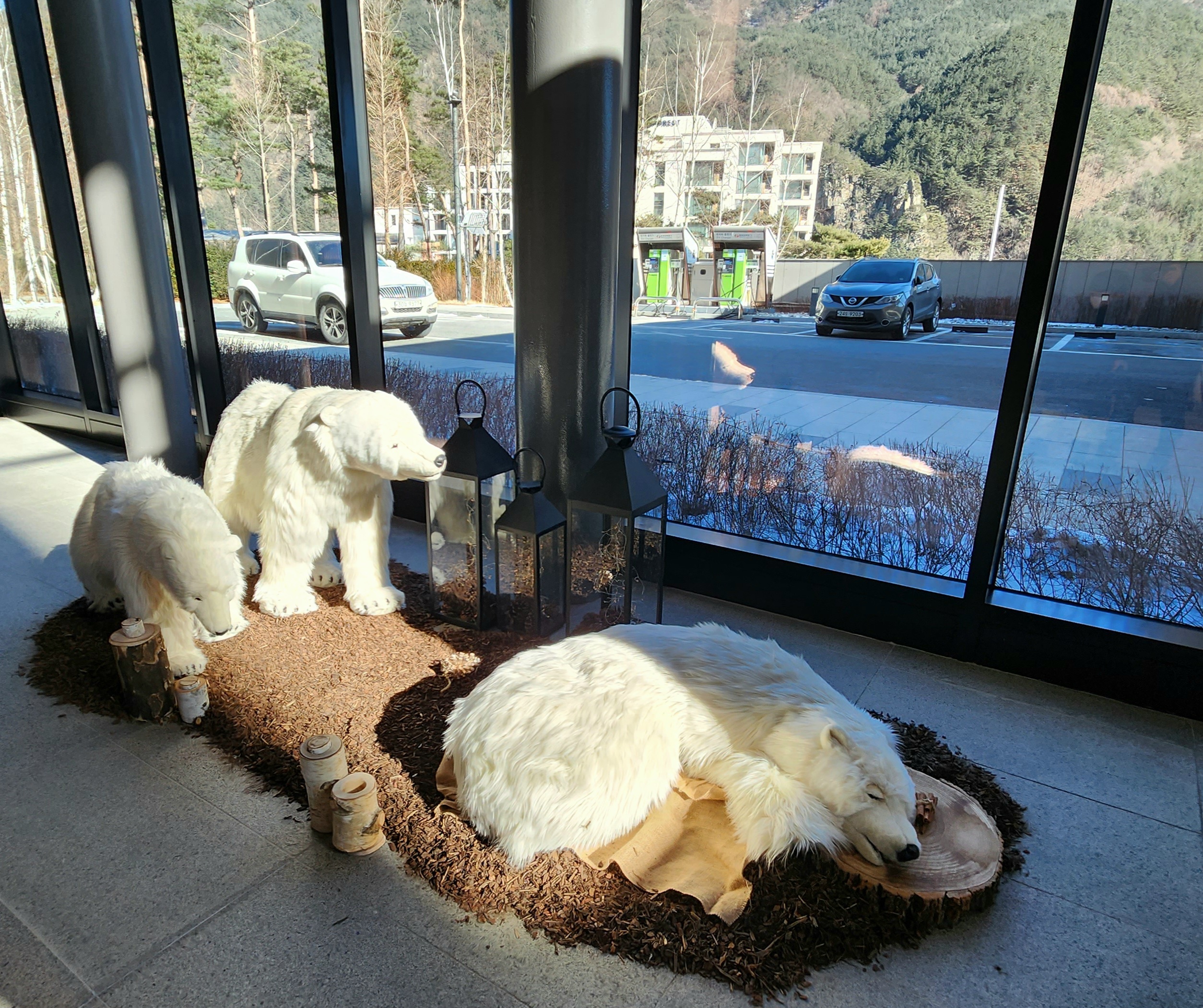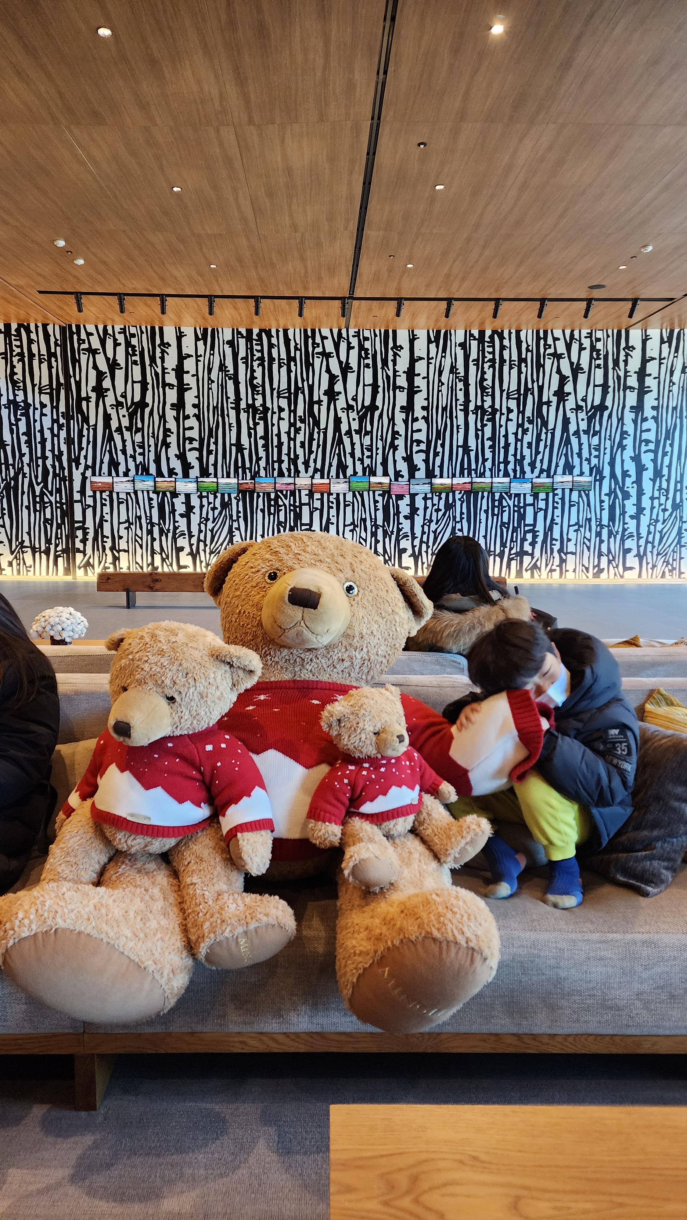호텔 로비에 대형 곰돌이 인형들이 있어서 동글이가 무척 좋아했었답니다.