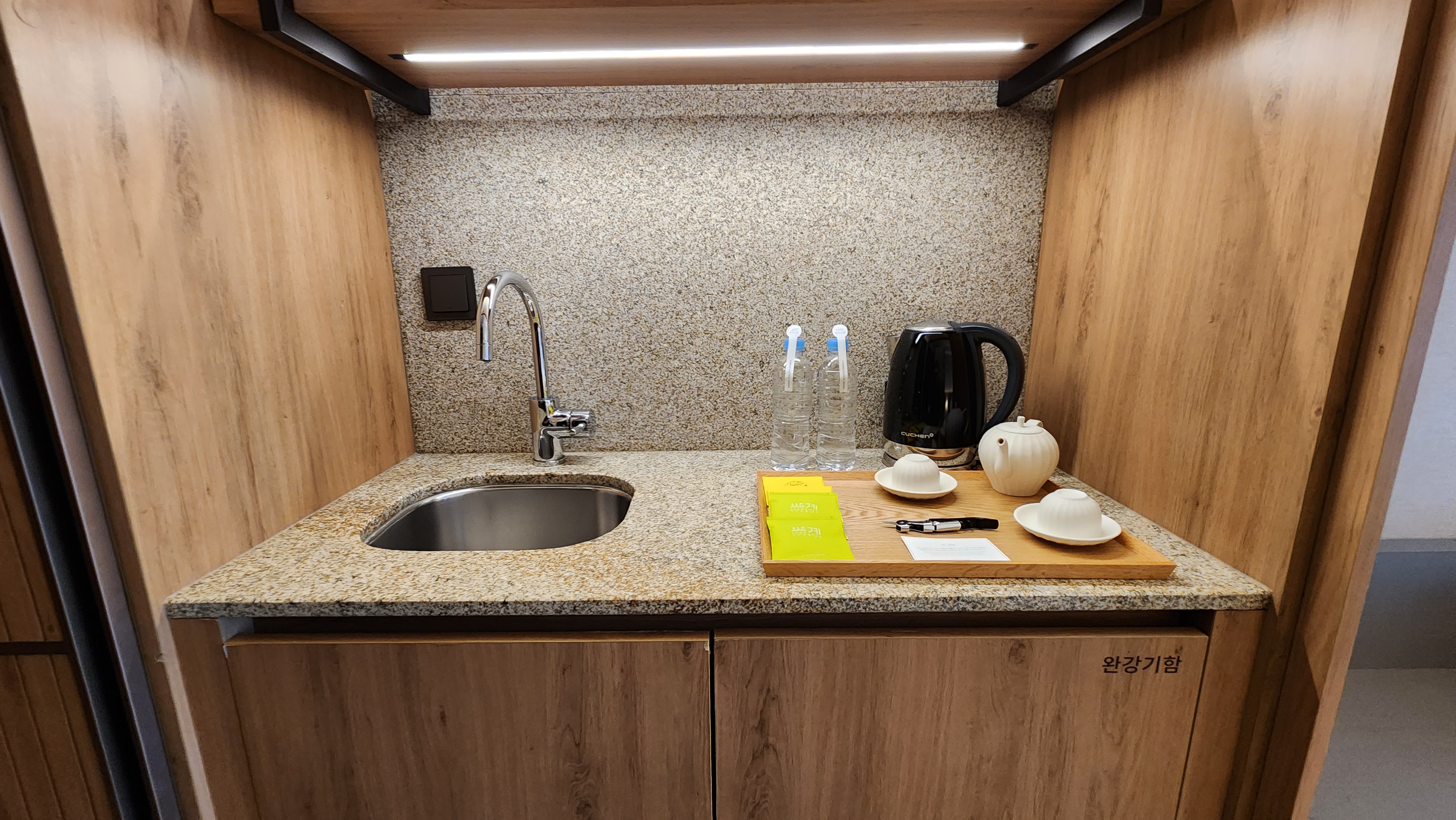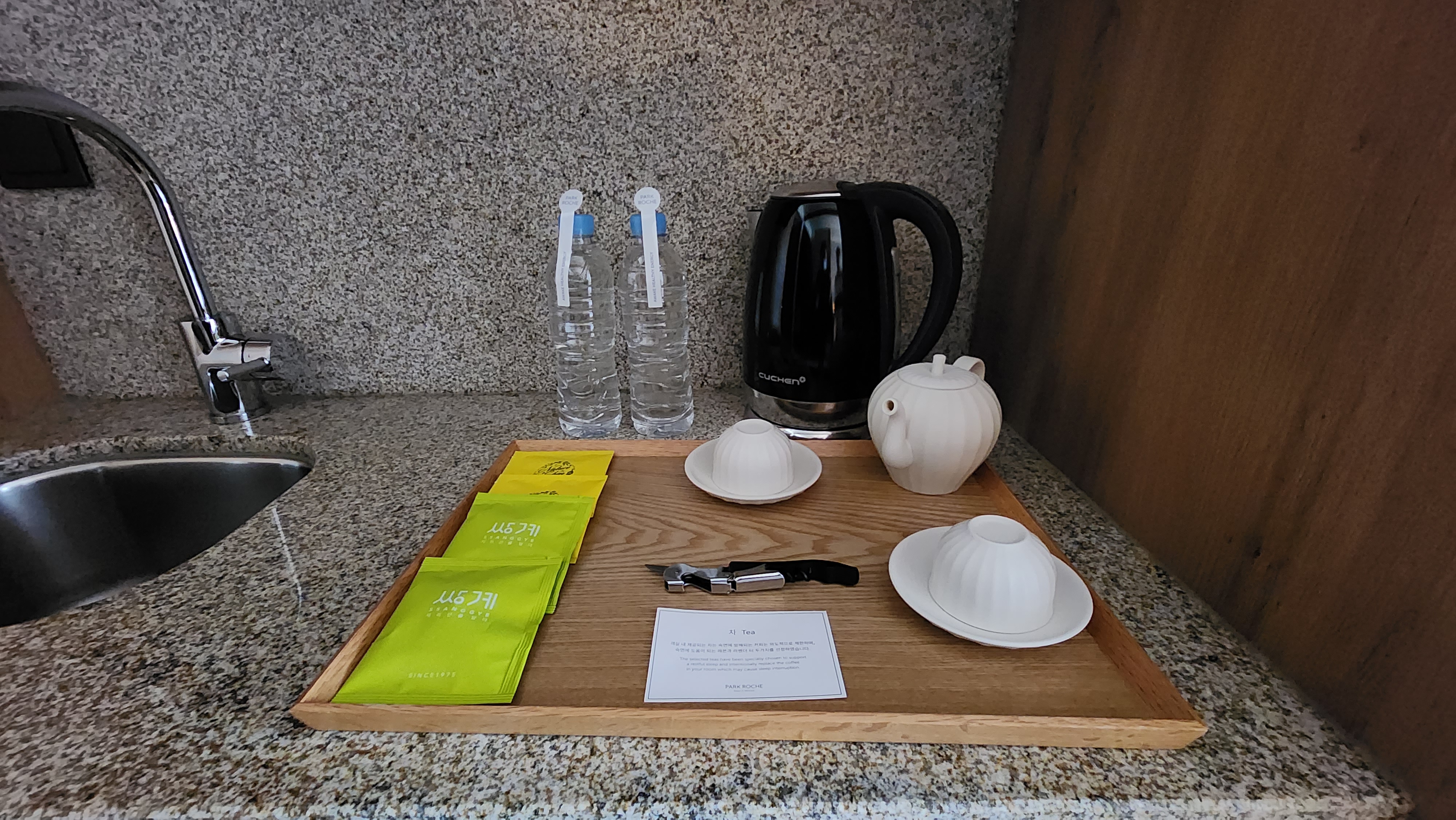 작은 싱크대도 마련되어있고, 커피포트와 생수2병, 스페셜티, 와인오프너, 다기가 준비되어있었어요.
