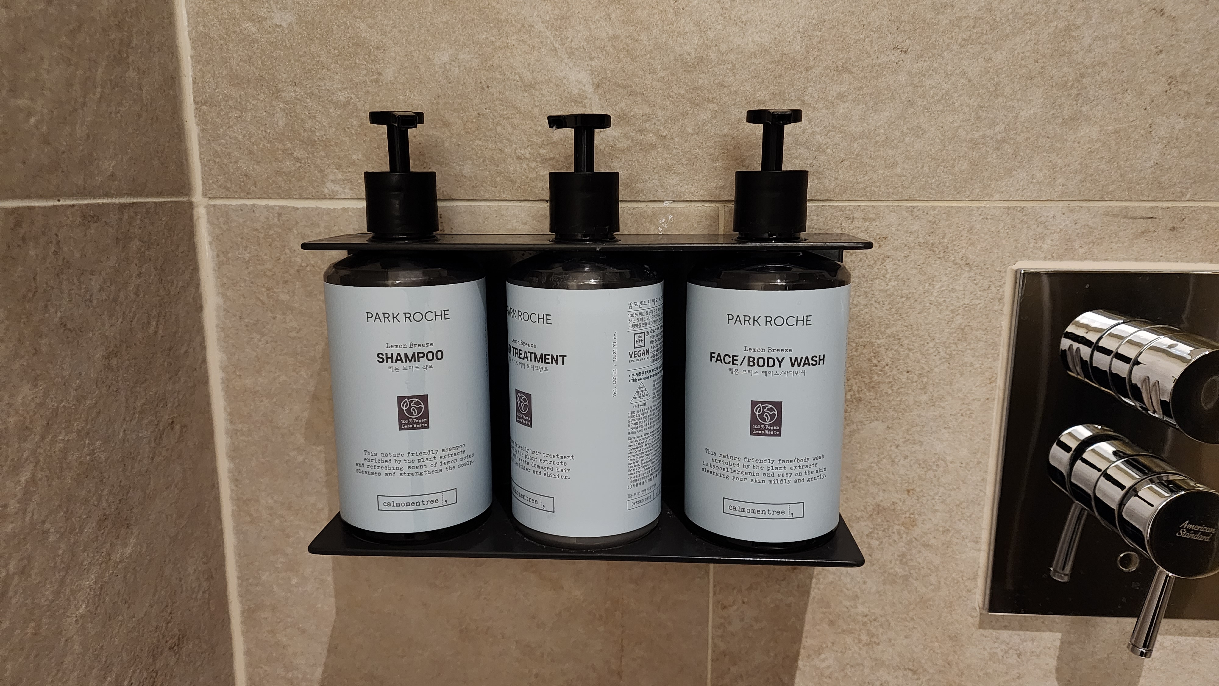 숙암트윈은 다회용 펌핑용기에 샴푸 등이 비치되어있었고, 칫솔, 빗 등은 나무재질의 것으로 준비되어 있었어요.