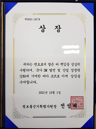 SW 육성 멘토링 최우수 멘토상 (2021년)